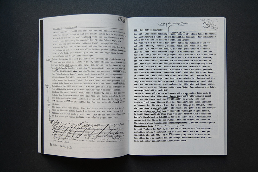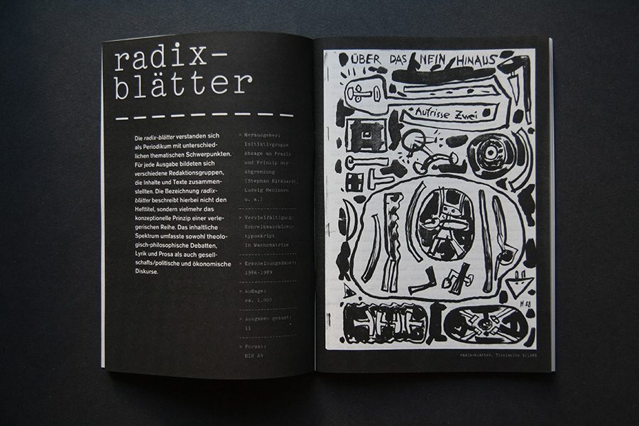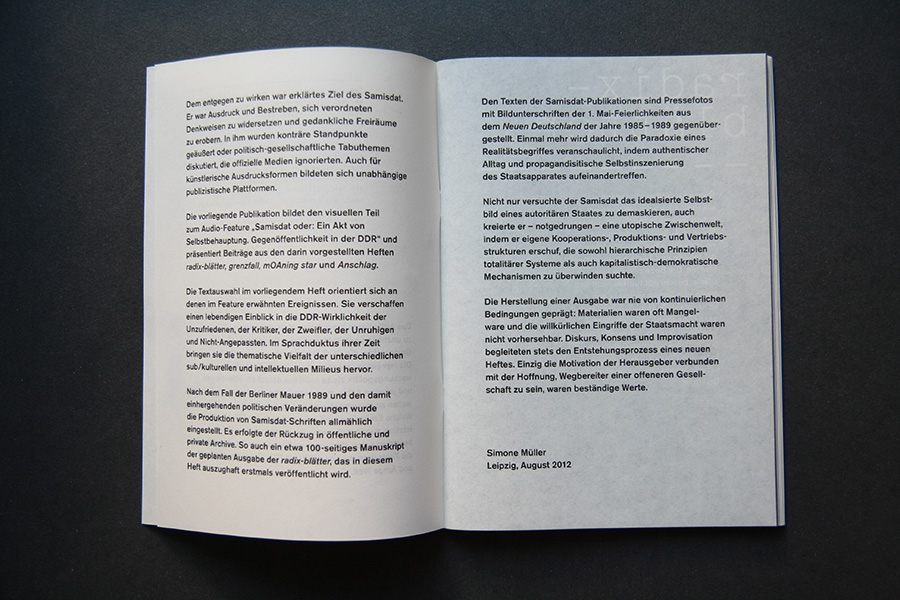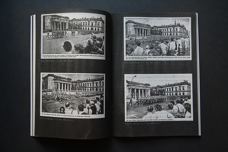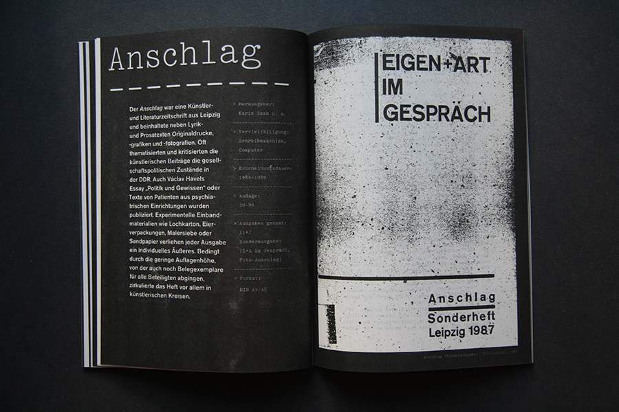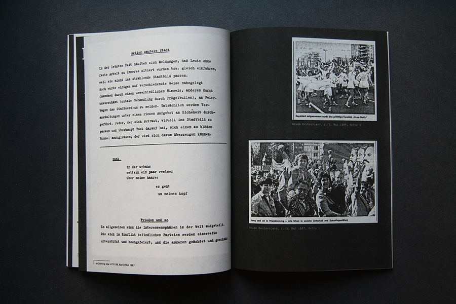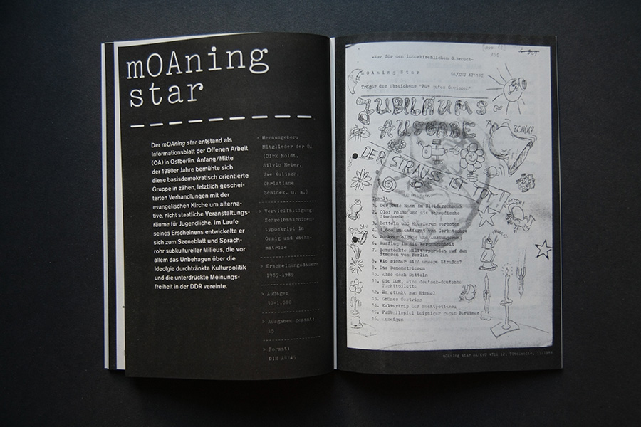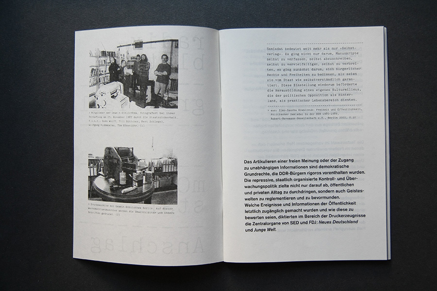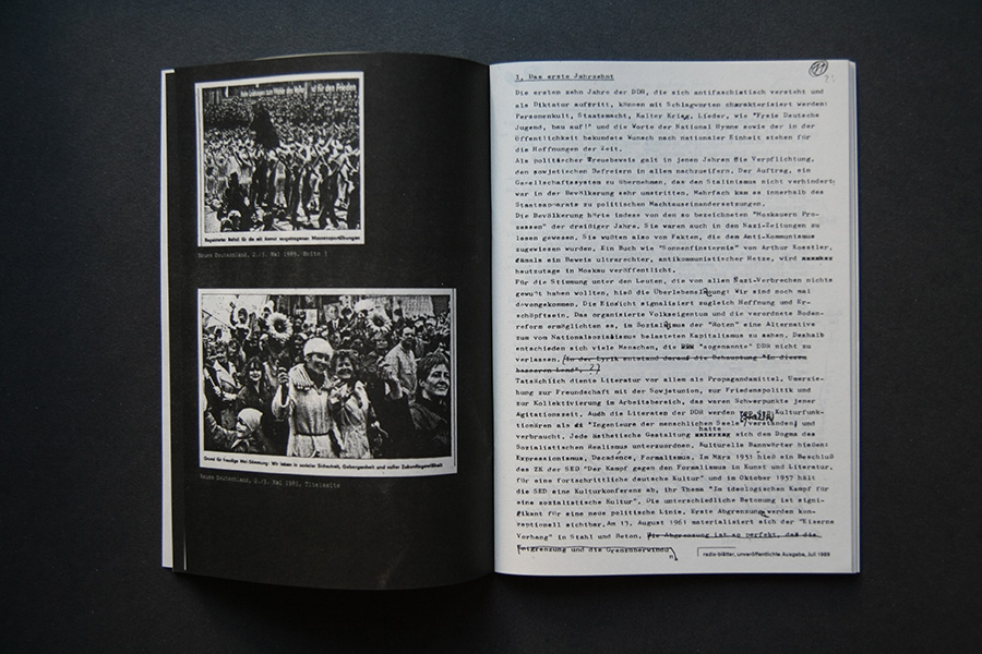 An interview collage with former publishers are presented in an audio feature along with faksimile riso-prints of the original publications. A poster of the pro-governmental newspaper "Neues Deutschland" shows the title page of May 1st from the years 1985 to 1989 and once more pictures the power of media control.