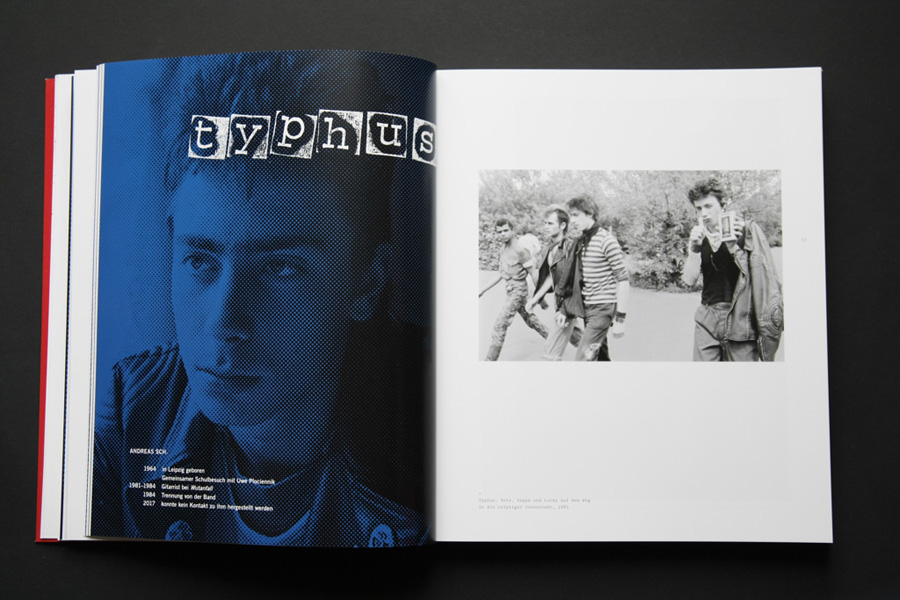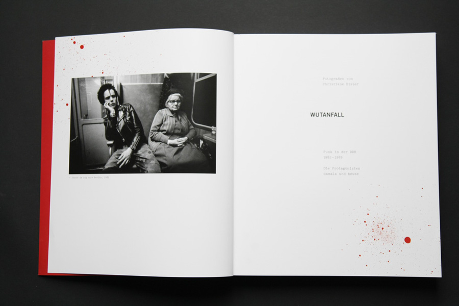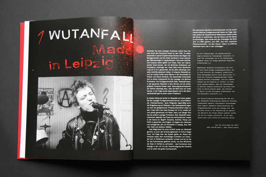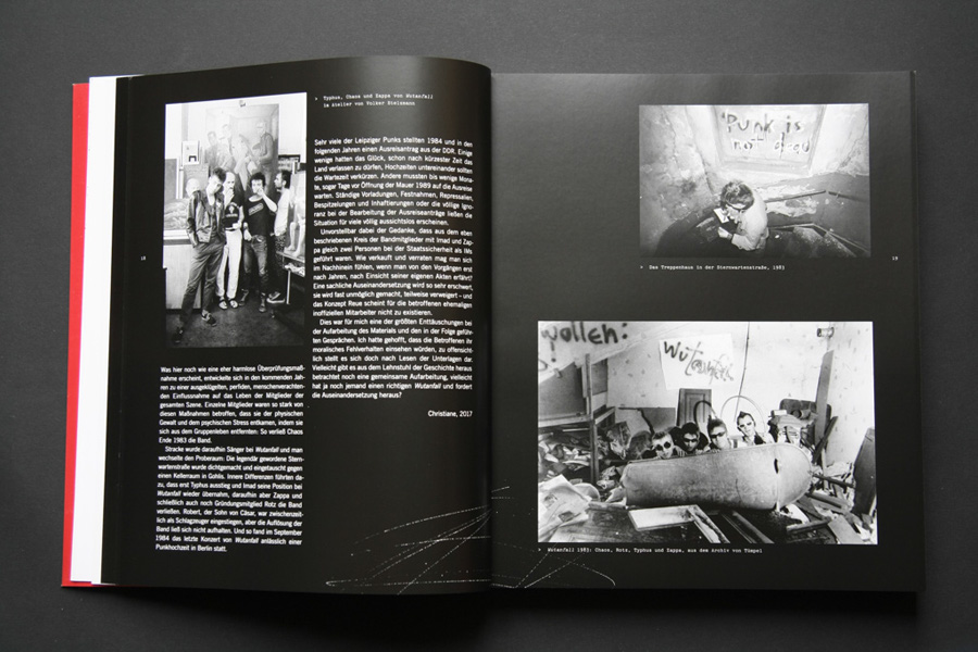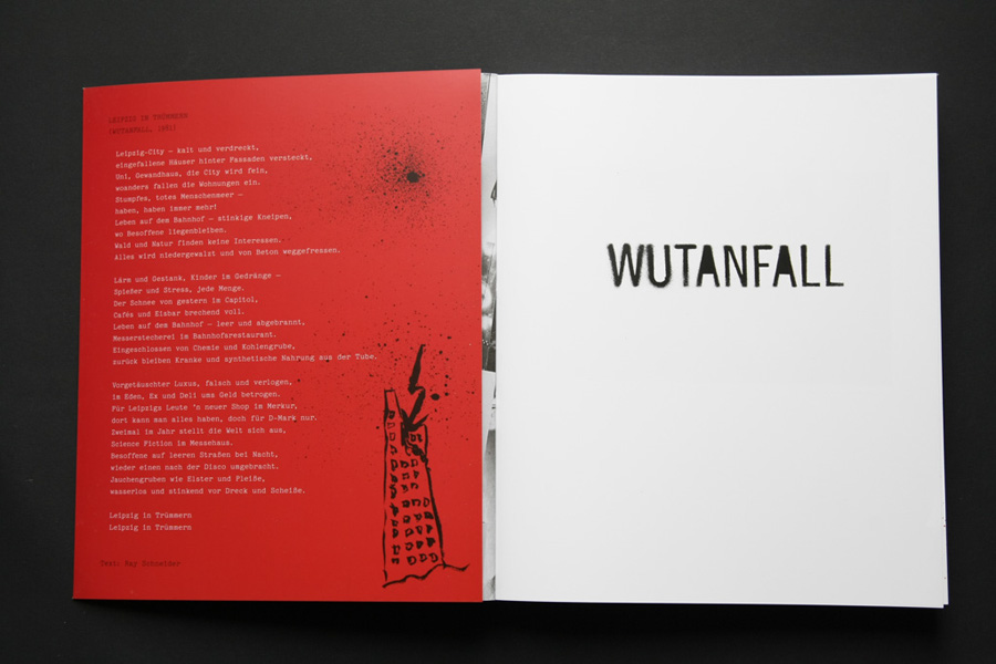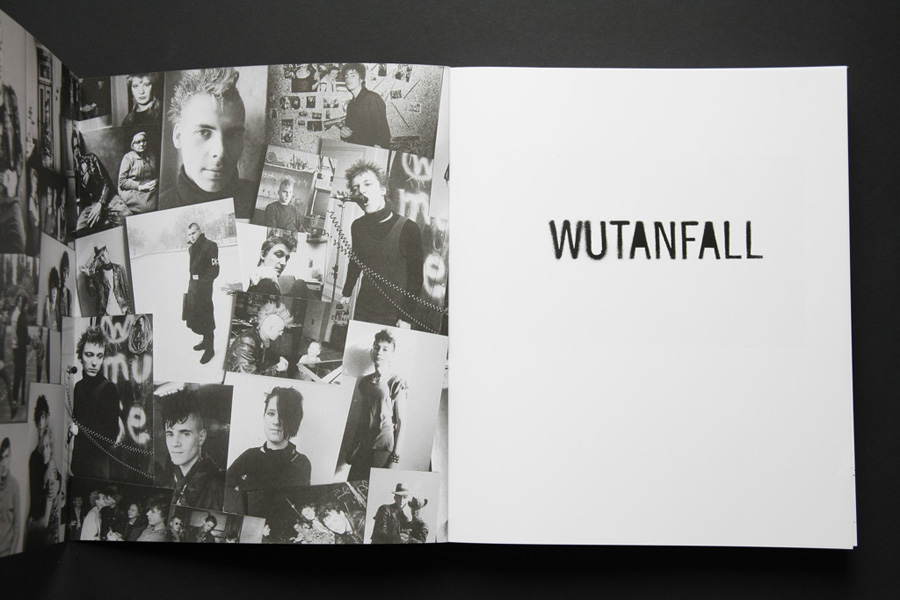 The book shows 20 portraits (in fold-out pages) of the main figures of a very small underground scene and their activities under an oppressive state that prohibited freedom of expression. It contains biographical essays from Christiane Eisler and the main characters telling their life stories under these circumstances and how the Stasi – (the GDR secret service) destroyed some of their lives. The title of the book „Wutanfall“ (rage attack) refers to a band name from an important Leipzig punk band.“