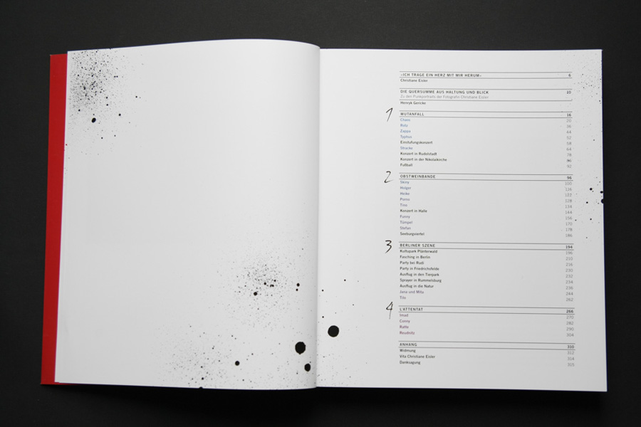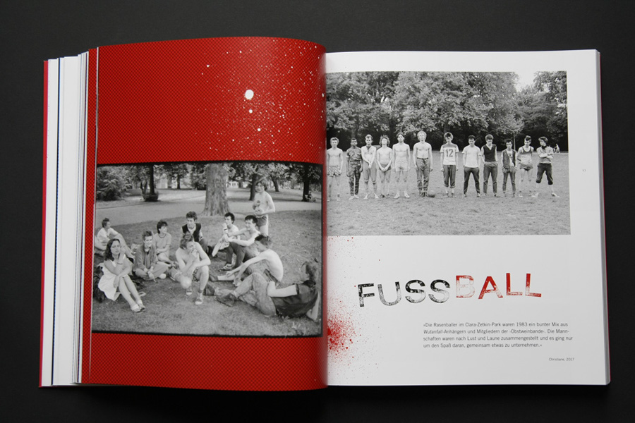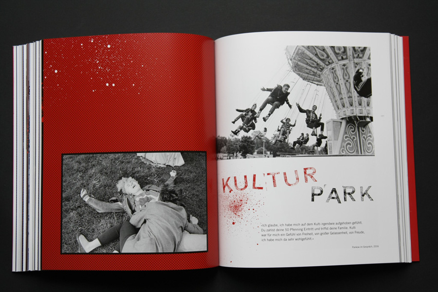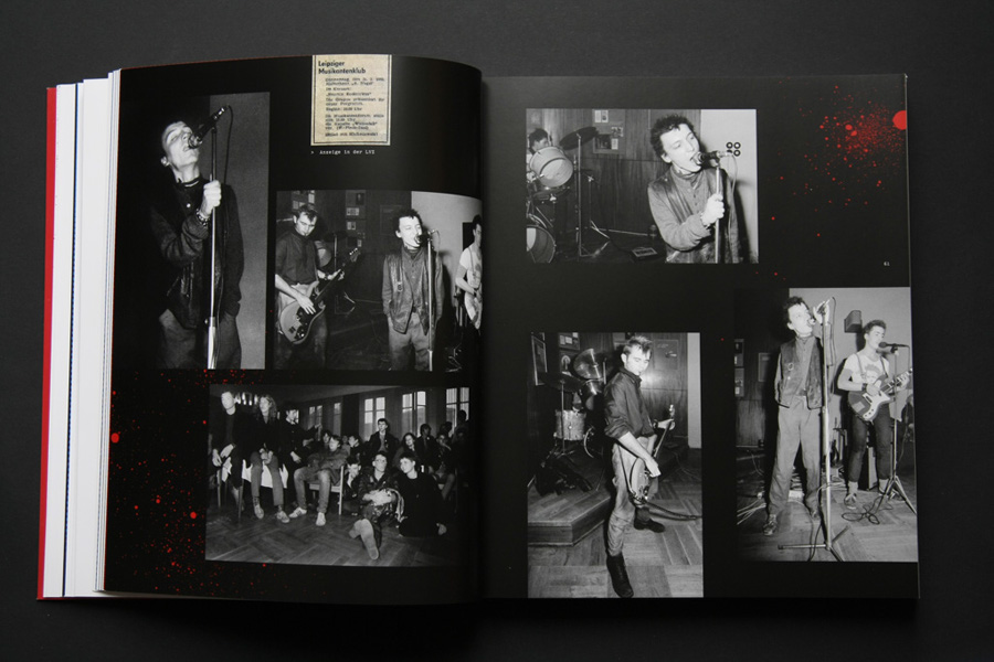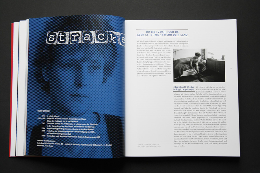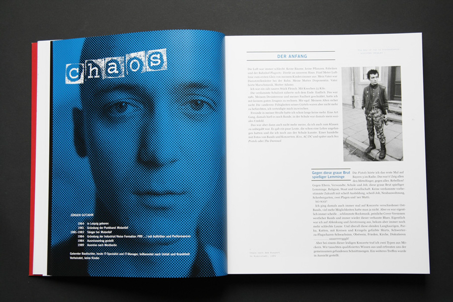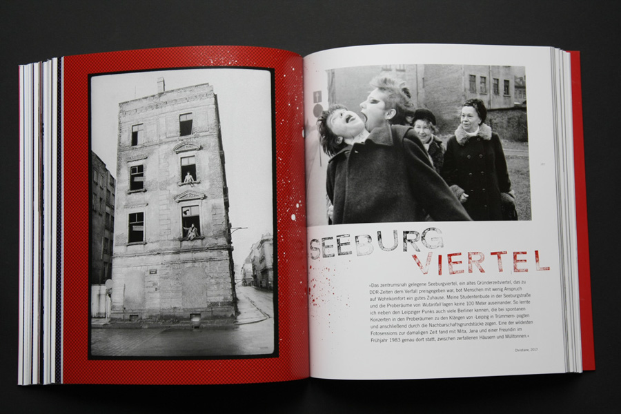 The book shows 20 portraits (in fold-out pages) of the main figures of a very small underground scene and their activities under an oppressive state that prohibited freedom of expression. It contains biographical essays from Christiane Eisler and the main characters telling their life stories under these circumstances and how the Stasi – (the GDR secret service) destroyed some of their lives. The title of the book „Wutanfall“ (rage attack) refers to a band name from an important Leipzig punk band.“